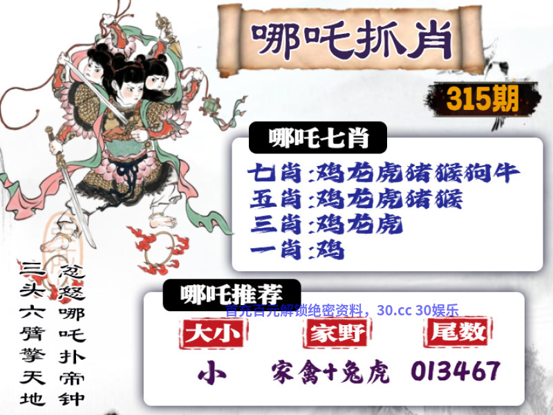 | 315期: ①七肖中特:鸡龙虎猪猴狗牛 ②大小中特:小数 ③家野+2肖:家禽+兔虎 ④精准六尾:013467 |